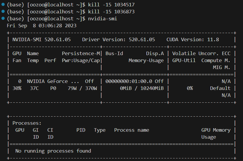 nvidia-smi 명령어를 사용하여 실행 중인 프로세스를 확인합니다.